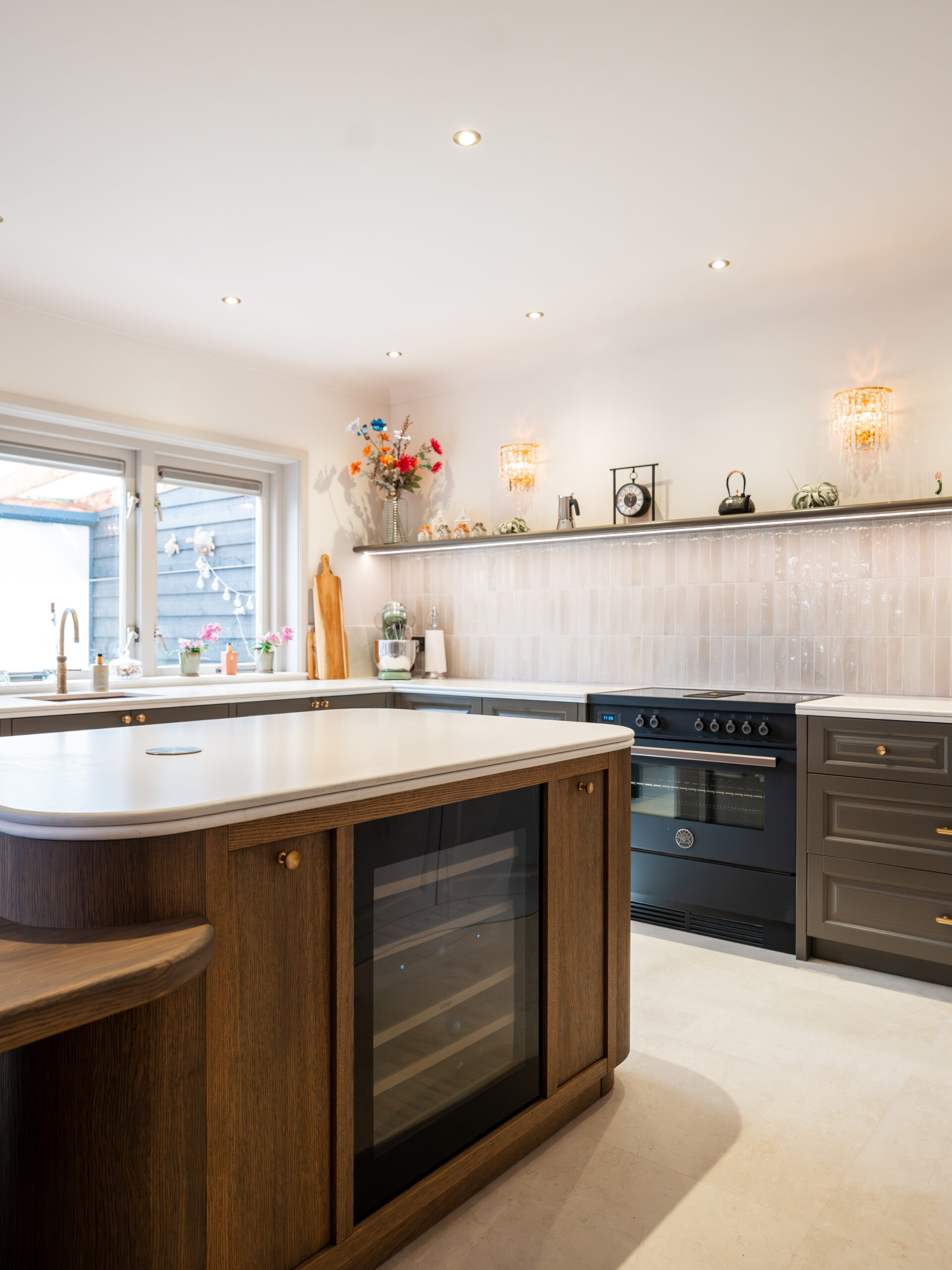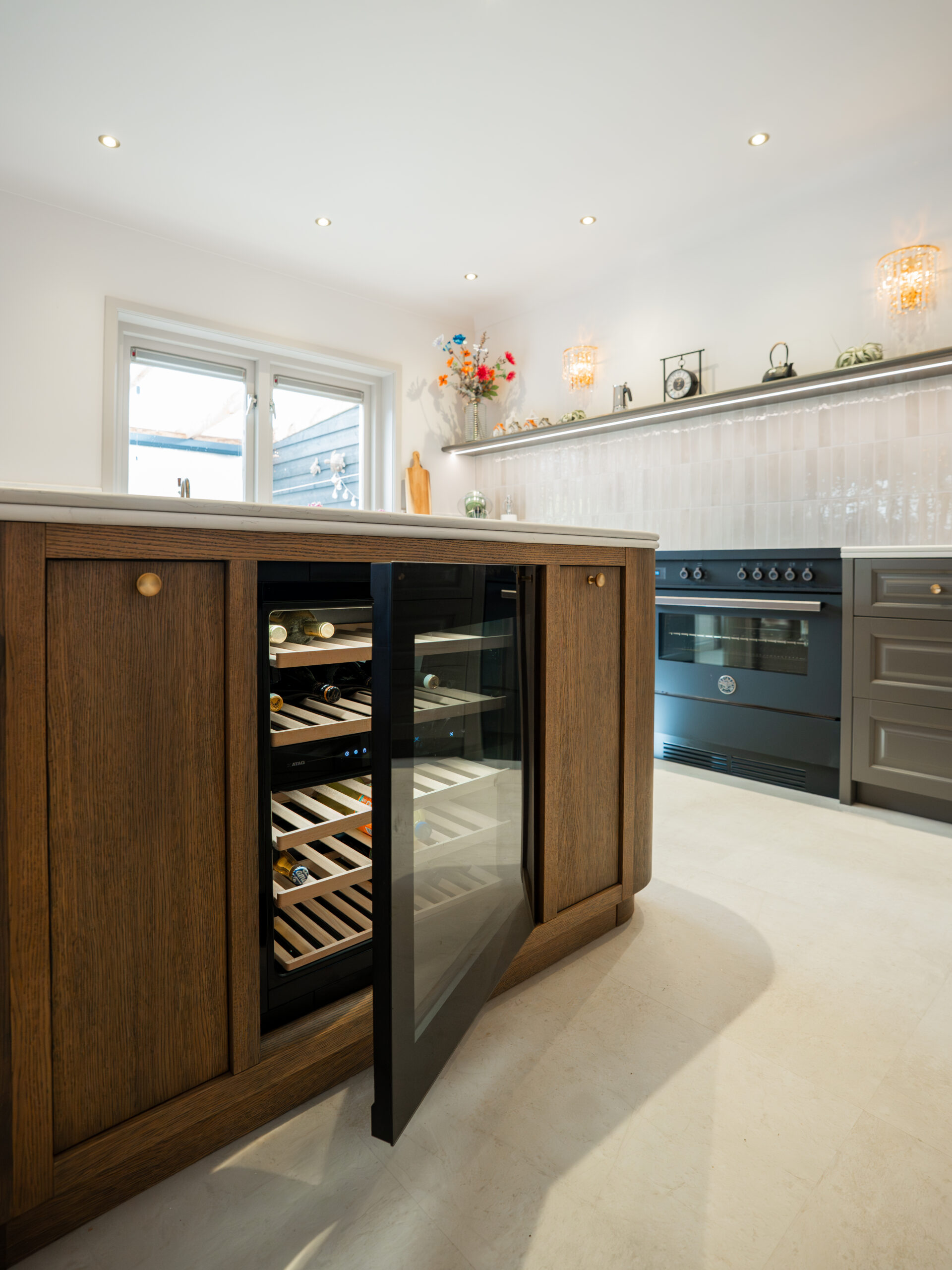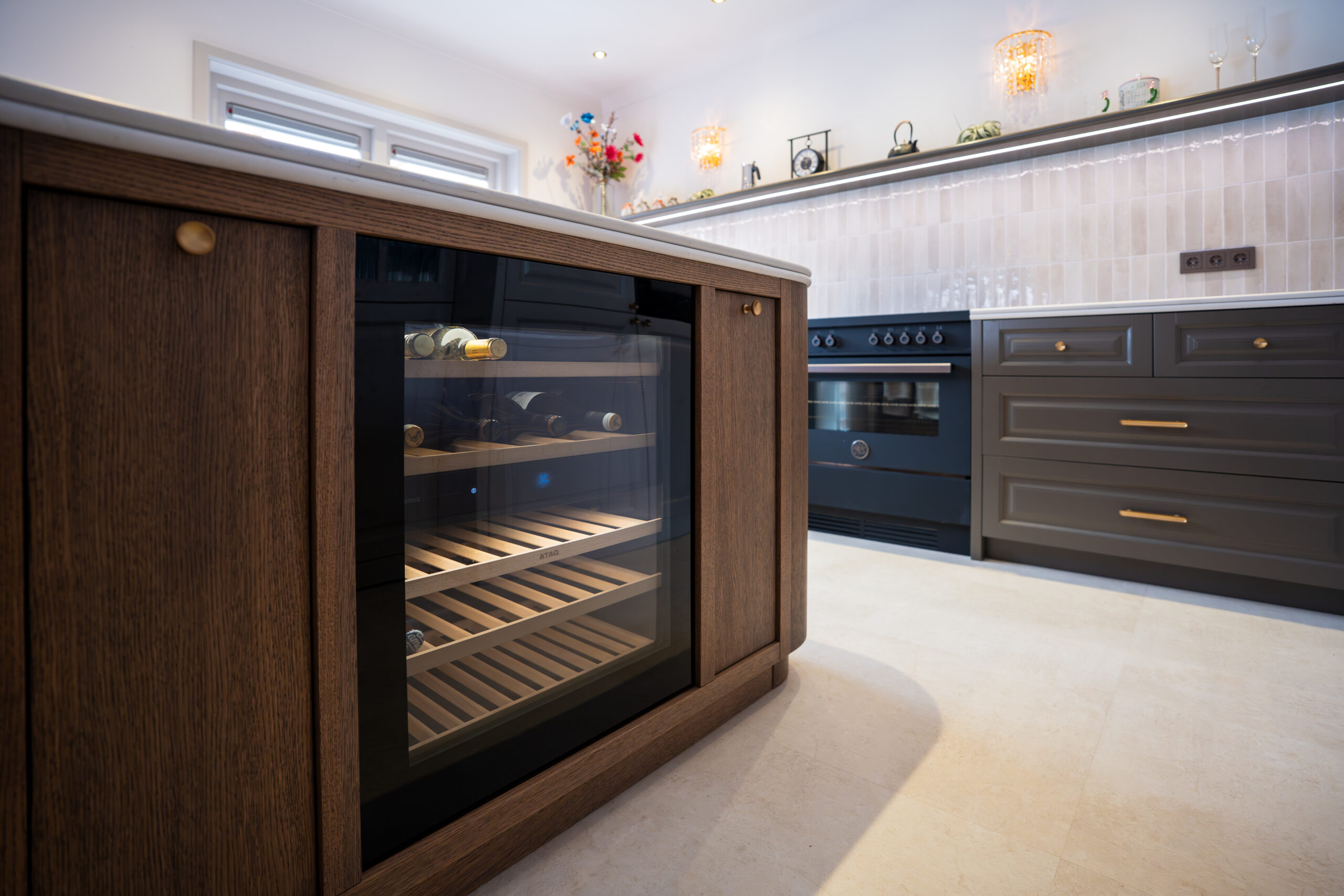 Het hart van de ruimte is het eiland in eiken fineer, uitgerust met een stijlvolle wijnkoeler. Daarnaast ontwierpen we een op maat gemaakte kamer en suite die perfect aansluit bij de rest van het interieur.