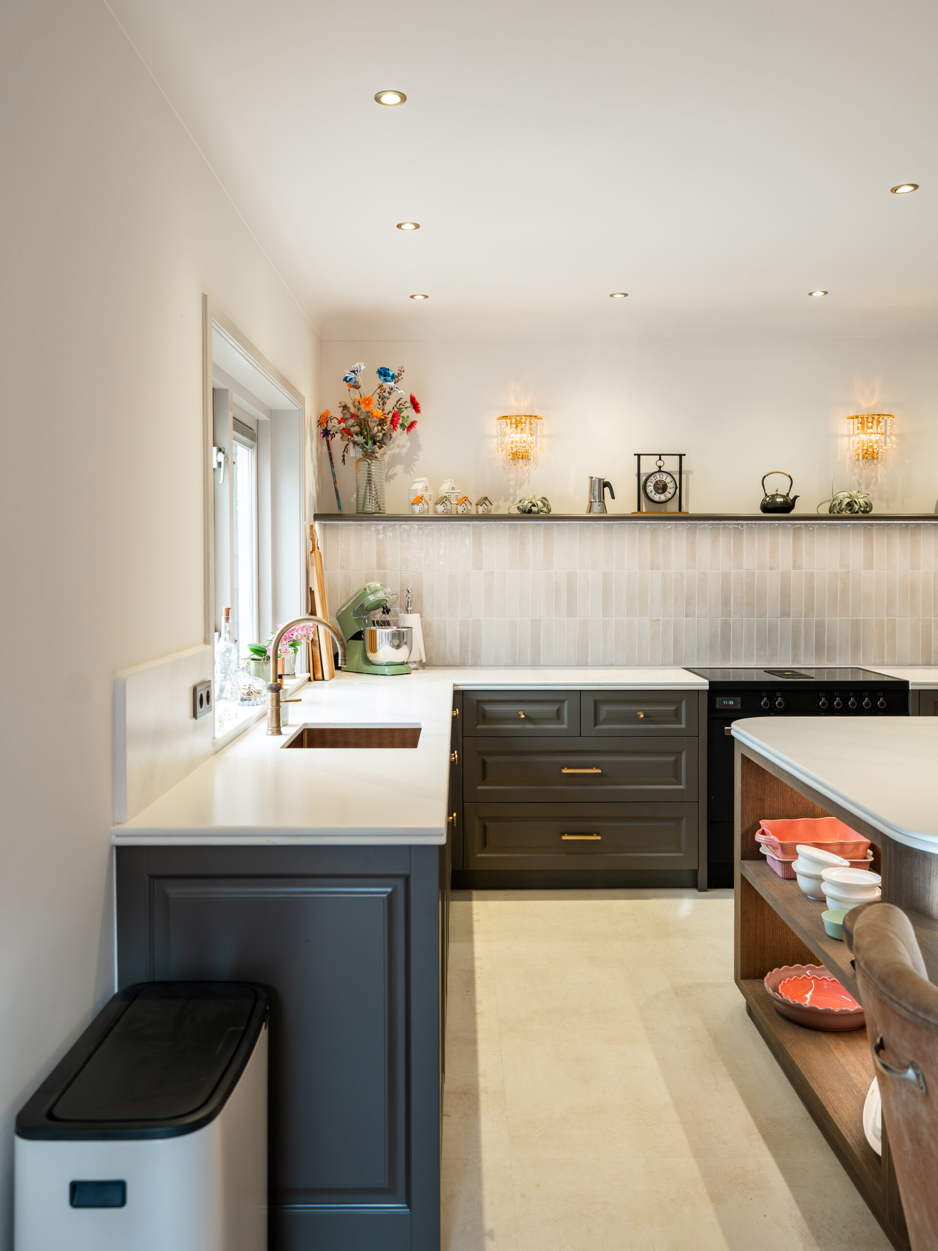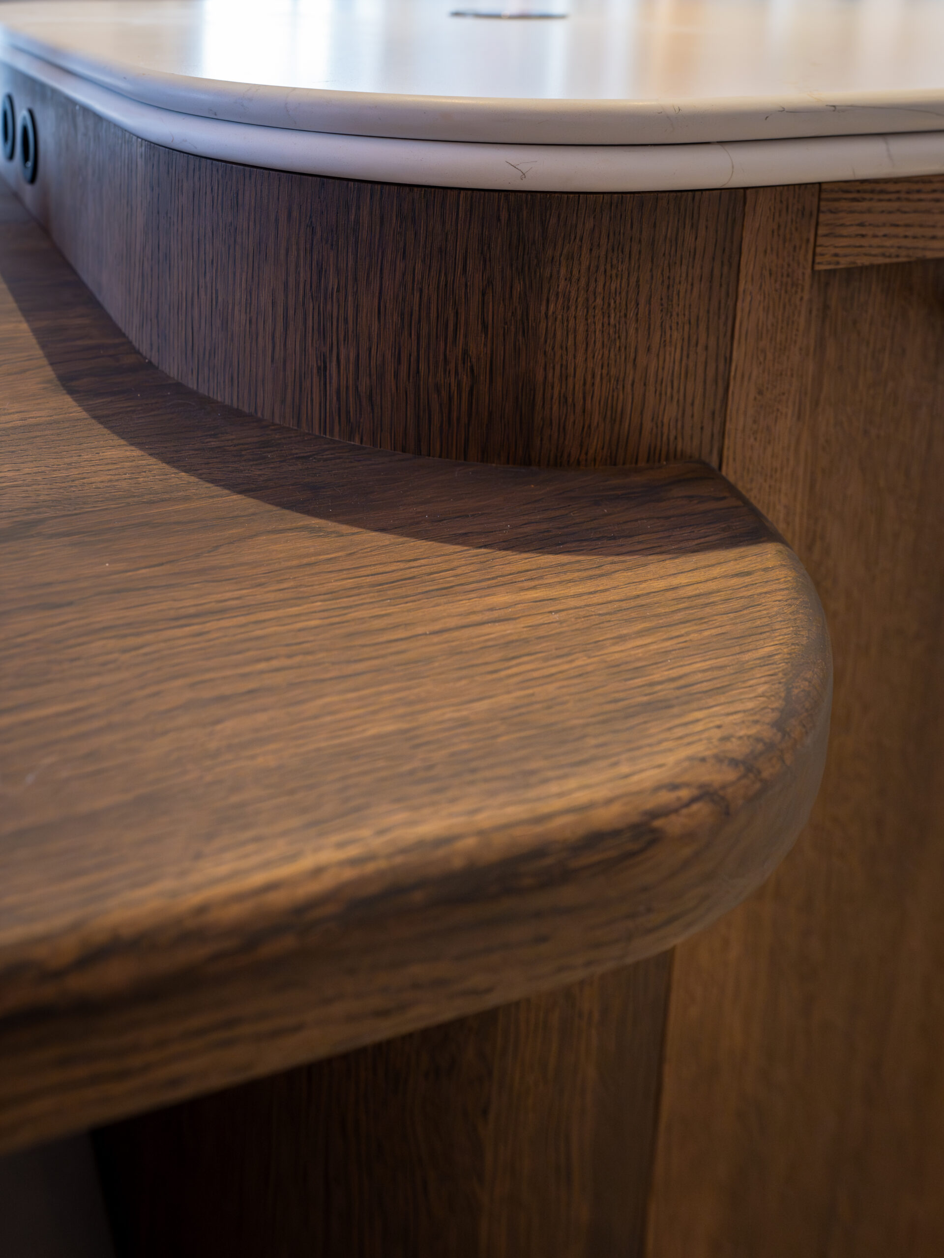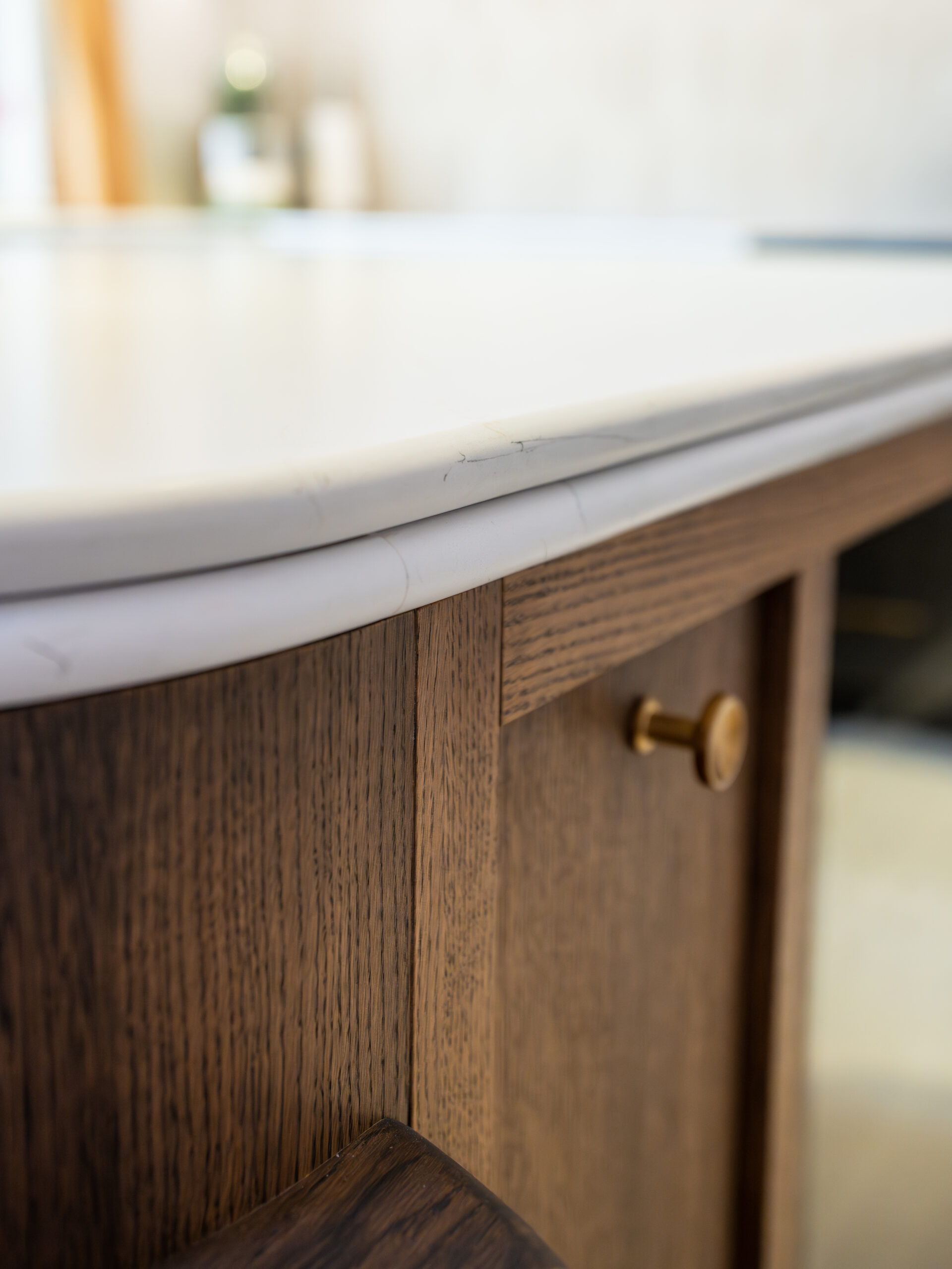 Het hart van de ruimte is het eiland in eiken fineer, uitgerust met een stijlvolle wijnkoeler. Daarnaast ontwierpen we een op maat gemaakte kamer en suite die perfect aansluit bij de rest van het interieur.
