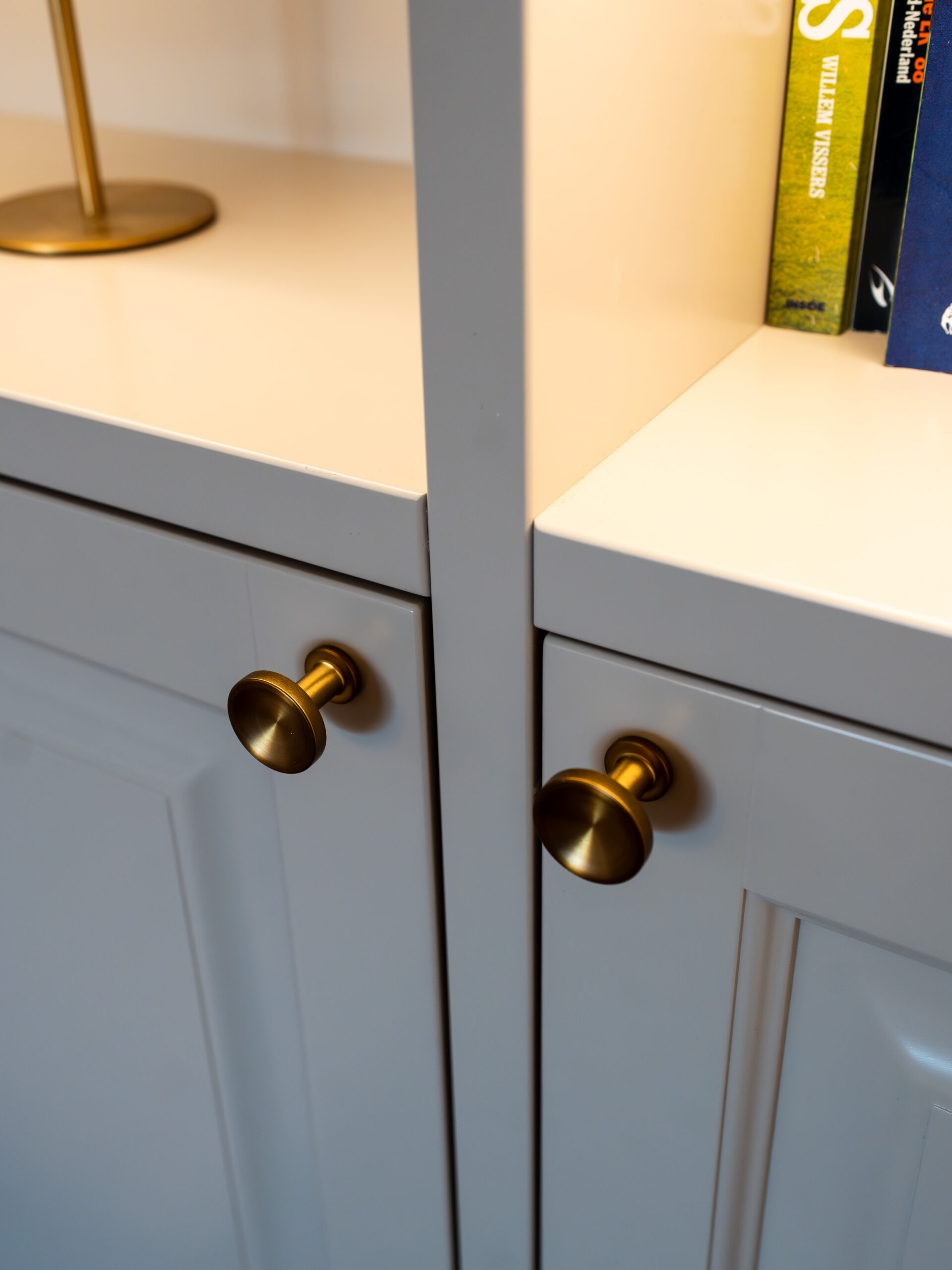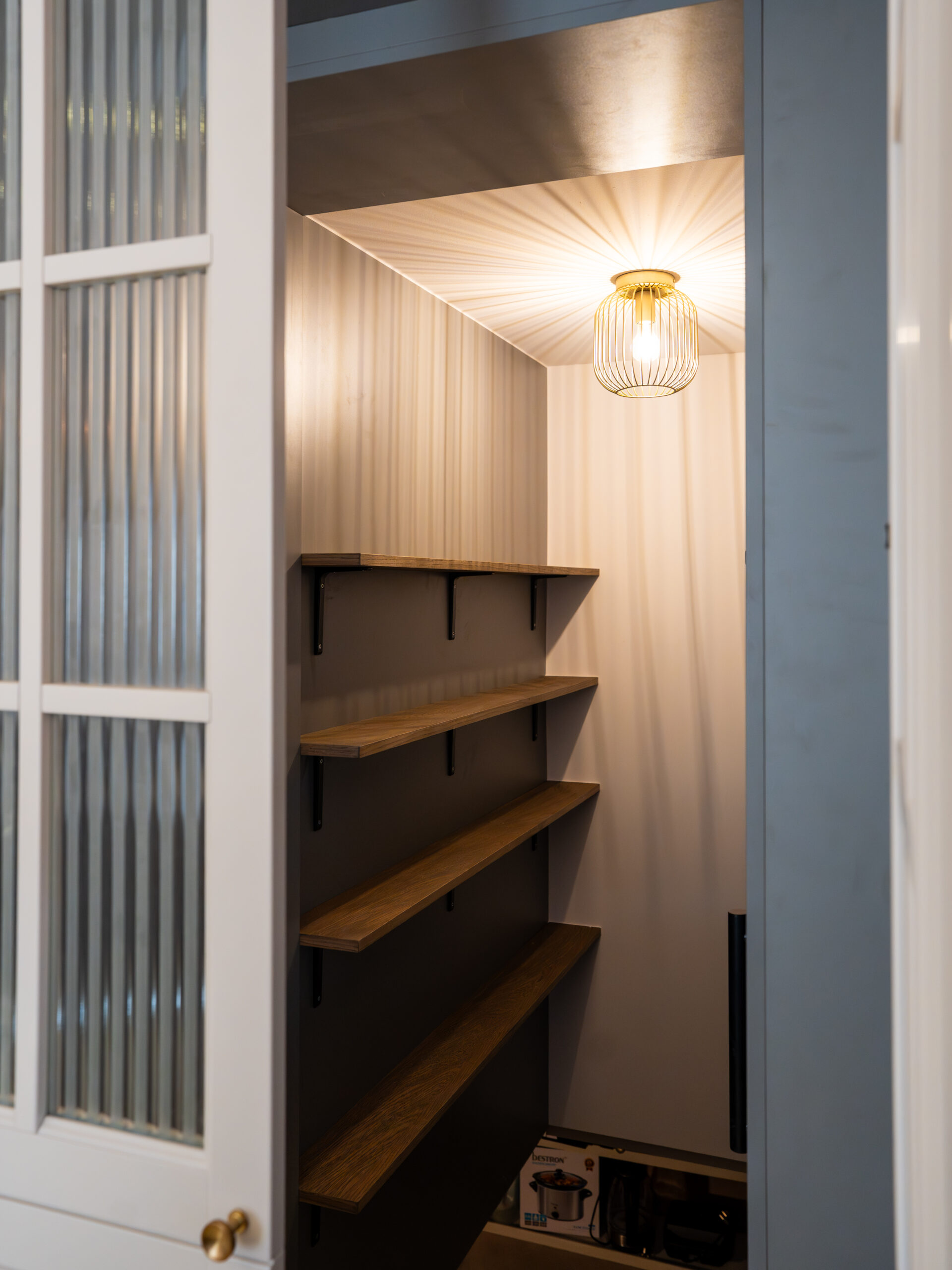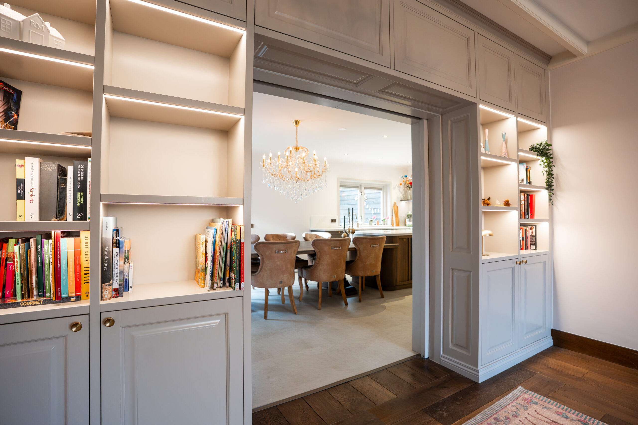 Een bijzonder en speels detail is de verborgen doorgang naar de kelder, naadloos weggewerkt in de keukenwand en alleen zichtbaar voor wie het weet.