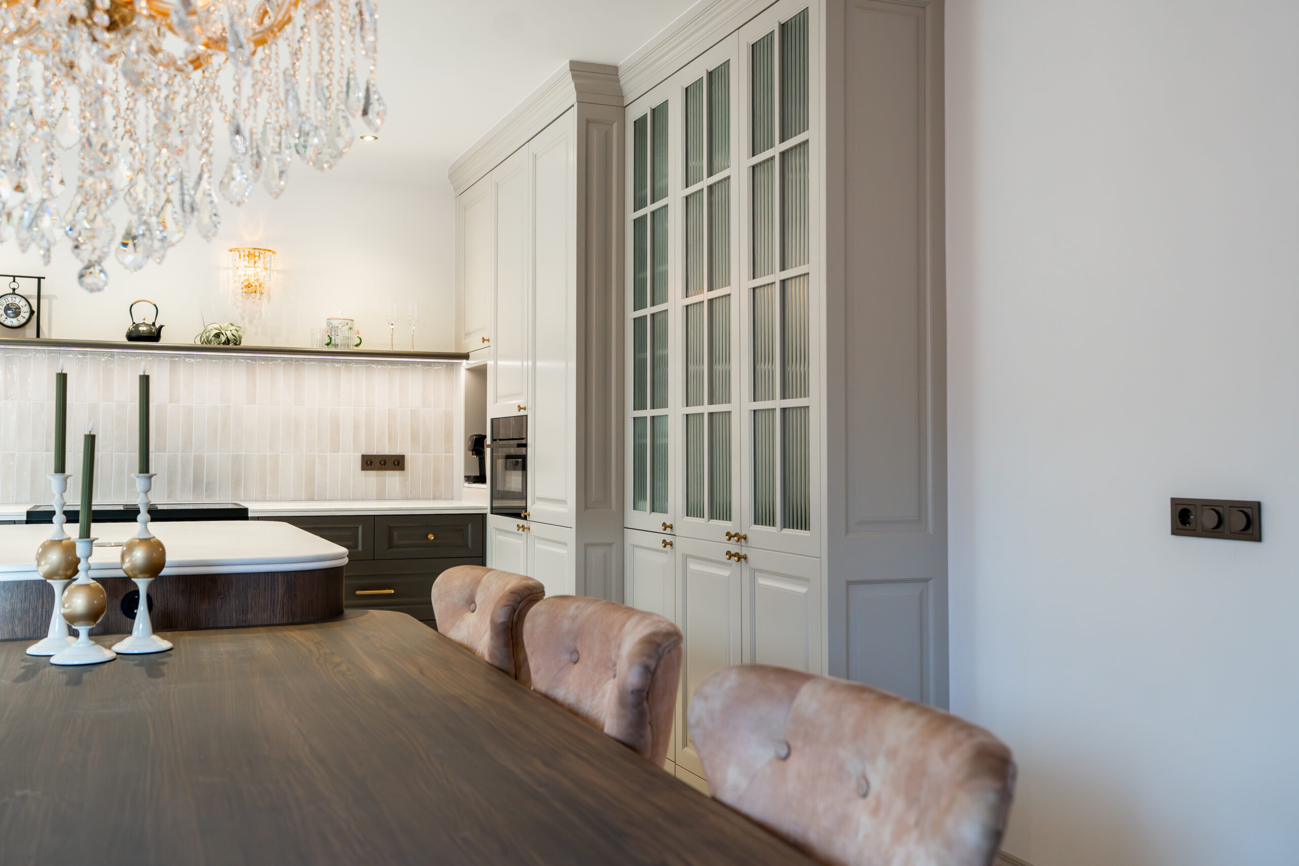 Voor dit exclusieve maatwerkproject realiseerden we een keuken en interieur waarin klassieke elegantie en verfijnde luxe centraal staan.